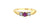 10K yellow gold ring, set with a 3.5mm ruby and 2 diamonds totalling .04 carat. Size 6.5 and may be slightly sized.